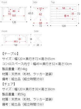 テーブルサイズ:幅120×奥行き72×高さ65cm コンロスペース内寸:幅49×奥行き32×高さ10cm 製品重量:約14kg 材質:天然木(杉材、ラッカー塗装) 備考:組立品(組立時間35分) ※こちらの商品は天然木を使用しておりますので、木目、節の位置、色味等に個体差がございます。