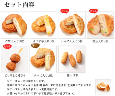 2020年6月17日正午追記 セット内容(生さつまあげ7種) ・ごぼう入り3枚 ・さつま芋入り3枚 ・れんこん入り3枚 ・枝豆入り3枚 ・とり棒3本 ・チーズ入り3枚 ・棒天3本 ※チーズ入りは角人参入りと変更可能です ※チーズ入りまたは角人参入りには「お父さんいつもありがとう」の文字と招き猫の印字が一枚ずつ入ります ※印字にはフラボノイド色素を使用しており、原料の一部に卵を含みます。